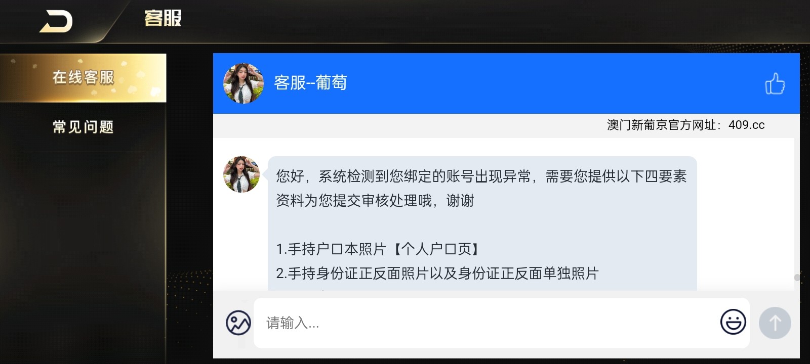 今天短信直接给的账号密码送了64.09彩金,登上去用彩金打到1200,提现需要充值余额的百分之30,充了400,然后提现退回了,找客服让我提供手持身份证,手持银行卡,手持个人户口本,还有一份当日报纸手持,这种情况有必要给他提供吗?
